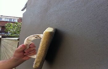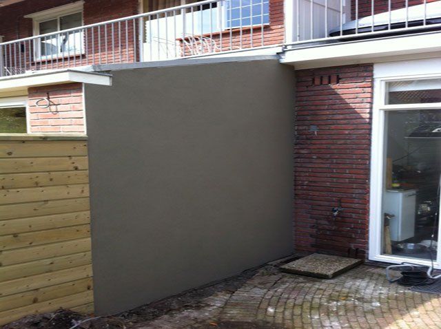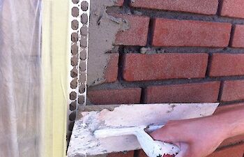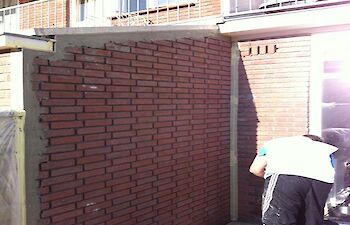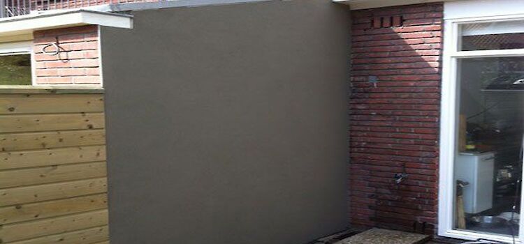 Aanbrengen cementgebonden raaplaag op vuil metselwerk. Als eindafwerking fijn schuurwerk (grijs).